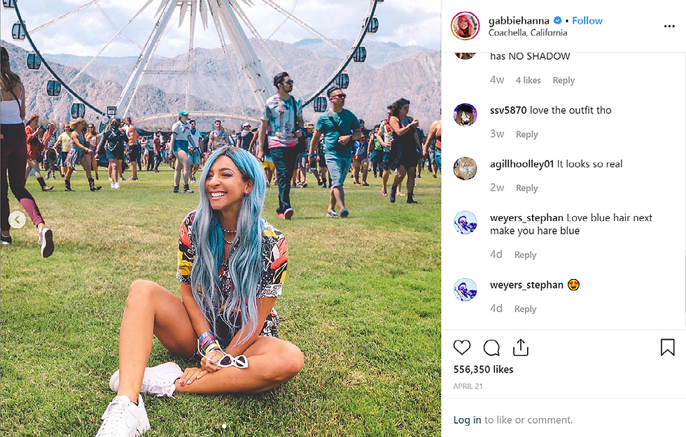 This social media star, Gabbie Hanna posted for days that she was at Coachella, I remember seeing this photo on my own social media feed seeing how cool it was that she was at Coachella, A few days later I saw she made a blog showing that she faked the whole thing and never went to Coachella which was hard to believe. She showed the before and after images of her friend who edited the photos. You can see them for yourself on her Instagram @gabbiehanna or the one who does the digital manipulating @kellansworld